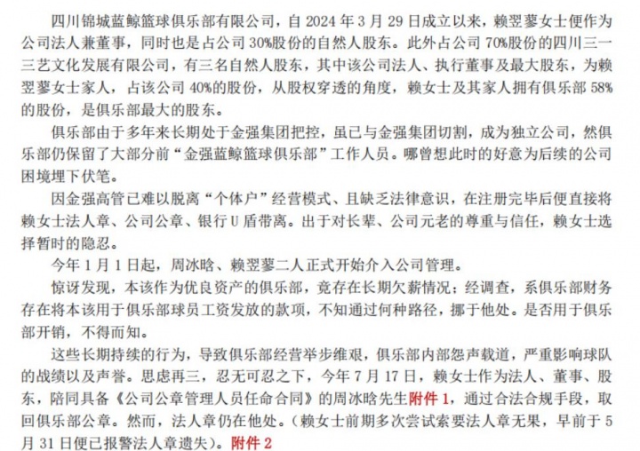 长文中透露,俱乐部长期处于金强集团把控,虽已切割,但仍保留大部分前工作人员,金强高管还带走了法人章、公司公章与银行U盾。