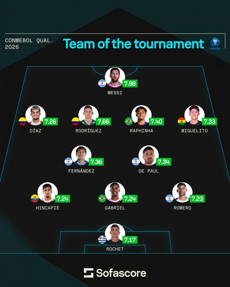 Sofascore南美世预赛最佳阵:梅西领衔,拉菲尼亚、恩佐、J罗在列