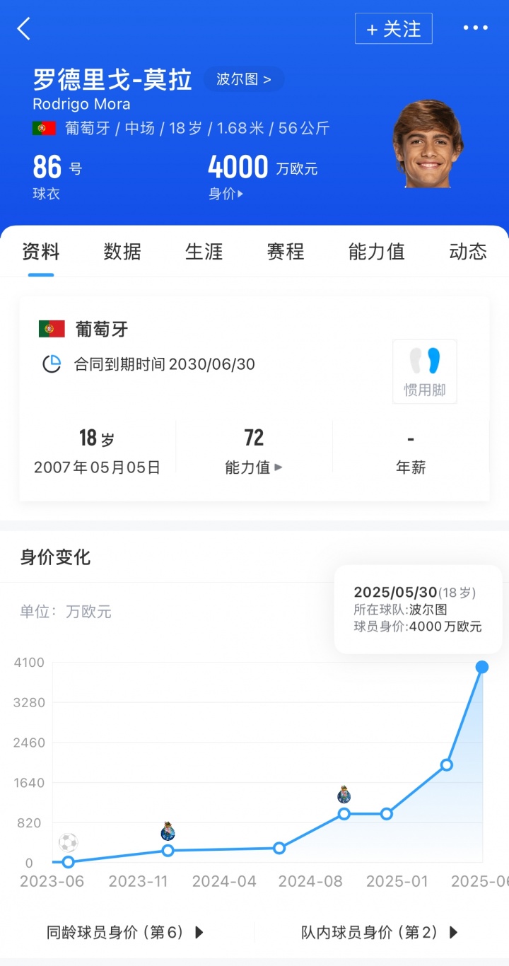莫拉现年18岁司职中场,身价4000万欧,去年升入波尔图一线队。目前代表球队出场36次,打进11球并送出4次助攻。