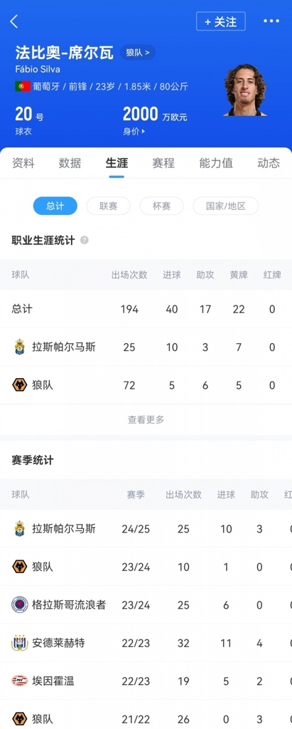 法比奥-席尔瓦现年23岁,2020年以4000万欧元转会费从波尔图加盟狼队,此后被多次外租。席尔瓦共为狼队出战72次打入5球6助攻,上赛季他效力拉斯帕尔马斯,出场25次打入10球3助攻。