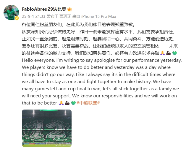 09月01日讯 国安外援法比奥社媒发文,为昨天球队0-6输给泰山的惨败向球迷道歉。