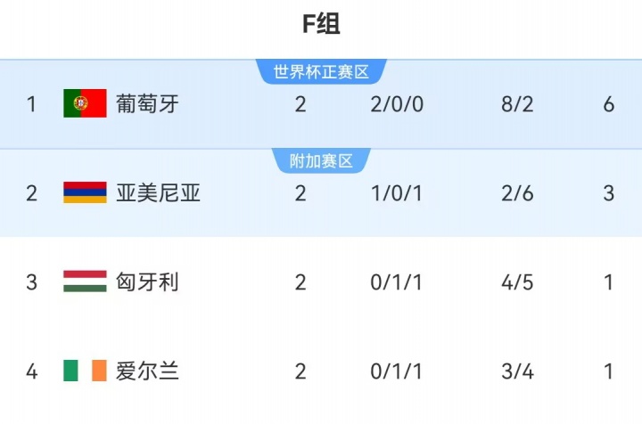 世预赛欧洲区F组积分榜↓