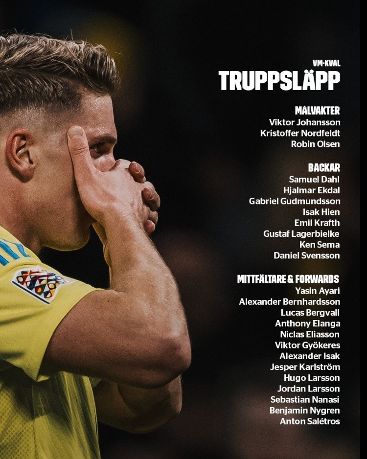 瑞典国家队名单:约克雷斯、伊萨克领衔,伊兰加、贝里瓦尔入选
