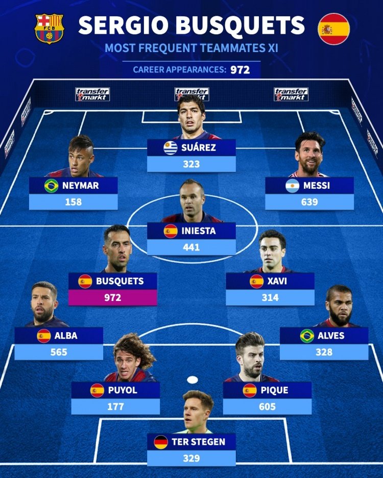 德转评布斯克茨最常搭档11人阵容:梅西639场第1,皮克605场第2