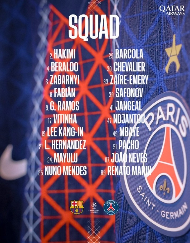 巴黎公布对阵巴萨名单:内维斯、法比安回归,K77、登贝莱缺席