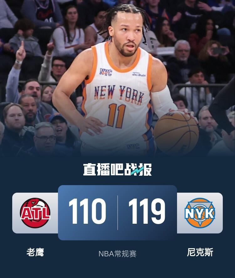 上半场,老鹰率先发力,连中三分打出18-8的开局,布伦森和麦克布莱德联手轰进4记三分带队反超,次节双方展开拉锯战,比分交替领先,老鹰持续发力打出9-2的攻势,半场战罢老鹰62-54领先尼克斯。下半场,尼克斯火力全开,布伦森和米卡尔-布里奇斯单节合砍26分,帮助球队单节轰下40分强势反超,末节尼克斯稳扎稳打保持领先,老鹰苦苦追赶也无力回天。最终,尼克斯119-110击败老鹰,主场过关。