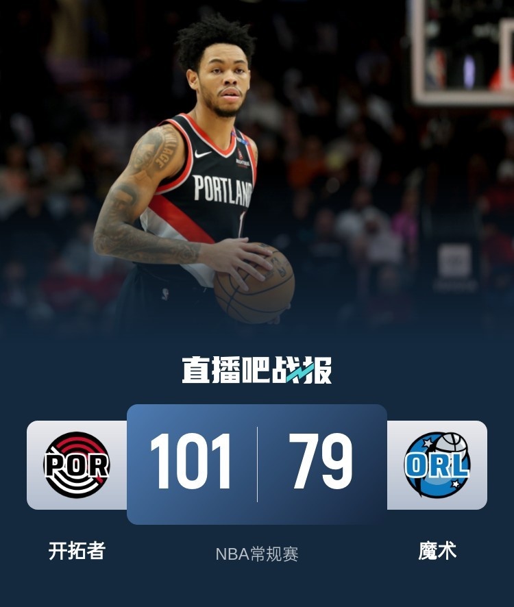 上半场,双方均表现慢热,连续打铁失误,得分非常困难,次节开拓者进攻回暖,安芬尼-西蒙斯得分助攻一肩挑带队占据场上主动,魔术依然失误连连,半场战罢开拓者47-39领先魔术。下半场,开拓者多点开花保持优势,魔术频频造成杀伤苦苦支撑,末节开拓者持续发力一举将分差拉开到20分杀死比赛。最终,开拓者101-79击败魔术,客场过关。