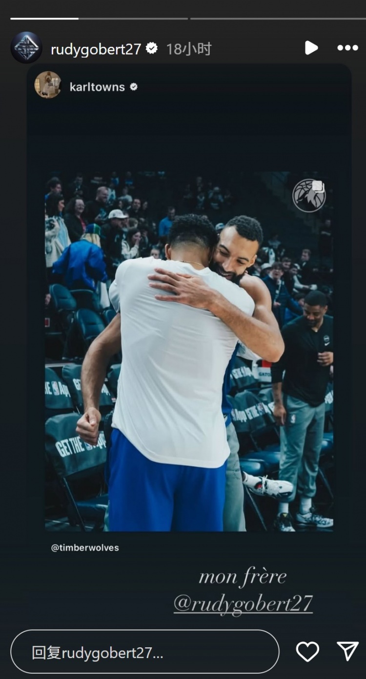 赛后,唐斯更新INS晒出本场和戈贝尔的合照,并用法语配文:“我兄弟。”而戈贝尔也是转发了该动态。