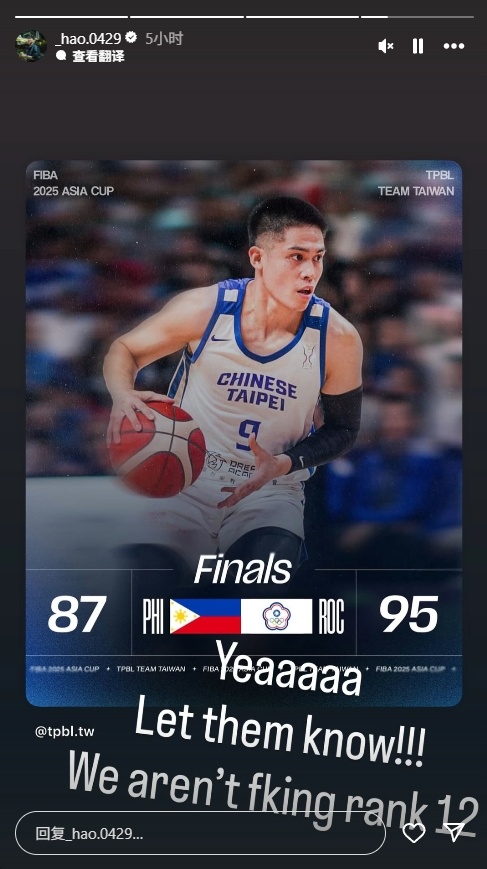 08月06日讯 2025年男篮亚洲杯小组赛,中国台北男篮以95-87战胜菲律宾男篮。赛后,中国台北男篮前锋、绰号“宝岛杜兰特”的马建豪更新社媒...