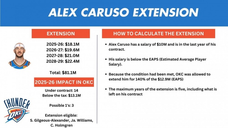 12月23日讯 据名记Shams今日报道,球员经纪人透露,卡鲁索四年8100万美元顶薪续约雷霆。薪资专家Bobby Marks晒出卡鲁索合同详情,卡鲁索...