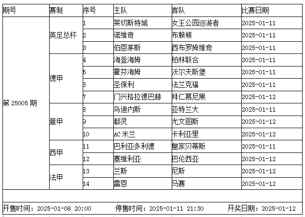 随着新年假期的结束,本周末欧洲联赛全面重燃战火。传足胜负彩第25005期竞猜赛事为英足总杯、德甲、意甲、西甲和法甲。较引人关注的是拜仁客场迎战门兴,尤文对阵同城对手都灵,刚刚在意大利超级杯上夺冠的AC米兰则将在主场面对弱旅卡利亚里。
