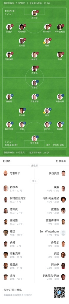 切尔西首发:1-罗伯特-桑切斯、25-凯塞多、34-阿奇姆蓬、3-库库雷利亚、6-科尔维尔、45-拉维亚、8-恩佐、11-马杜埃凯、20-帕尔默、19-桑乔、15-杰克逊