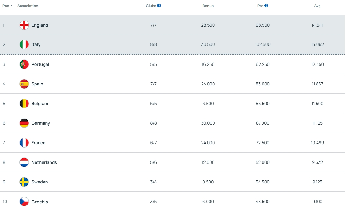 榜单前5五大联赛仅占3席,葡超和比甲目前处在第3和第5。根据欧战新规,欧战积分前二的联赛将在下赛季各获得一个额外的欧冠参赛席位,例如本赛季获得席位的是德甲(多特)和意甲(博洛尼亚)。