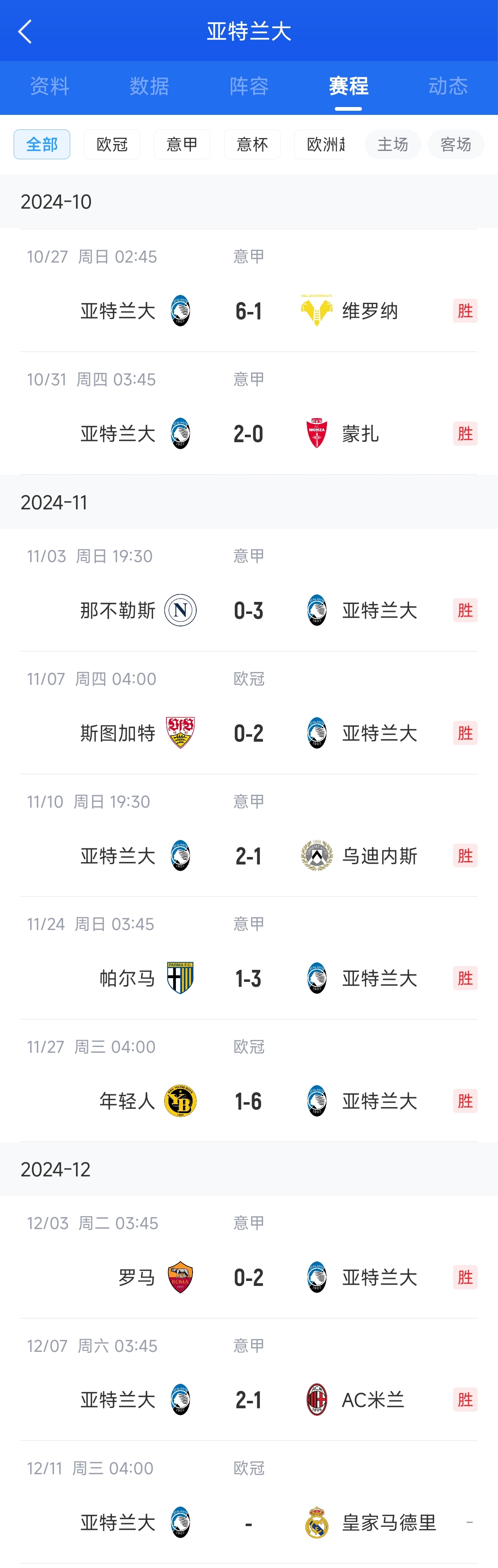 亚特兰大在这阶段打出了两场6-1(维罗纳+年轻人),此外还有3-0那不勒斯、2-0斯图加特、2-0罗马以及2-1米兰这样不俗的表现。