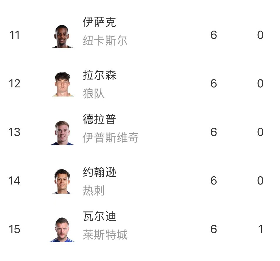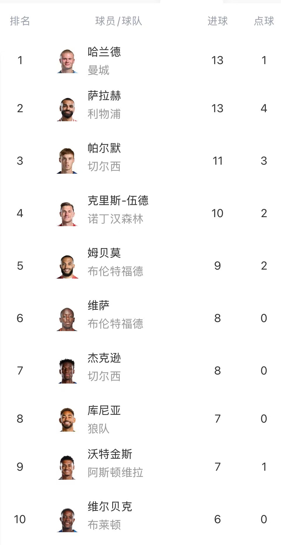 英超射手榜前15: