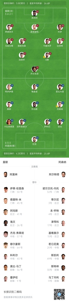 曼联首发:24-奥纳纳、2-林德洛夫、4-德里赫特、15-约罗、3-马兹拉维、20-达洛特、14-埃里克森、18-卡塞米罗、8-B费、17-加纳乔、11-齐尔克泽