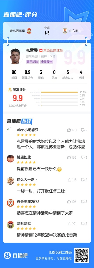 【】中超第四轮最佳球员:基莱斯当选,为了天津永远进攻!