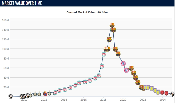 巅峰期的库蒂尼奥身价曾高达1.5亿欧,那时候他26岁。仅仅约6年的时间,他的身价已只剩600万。