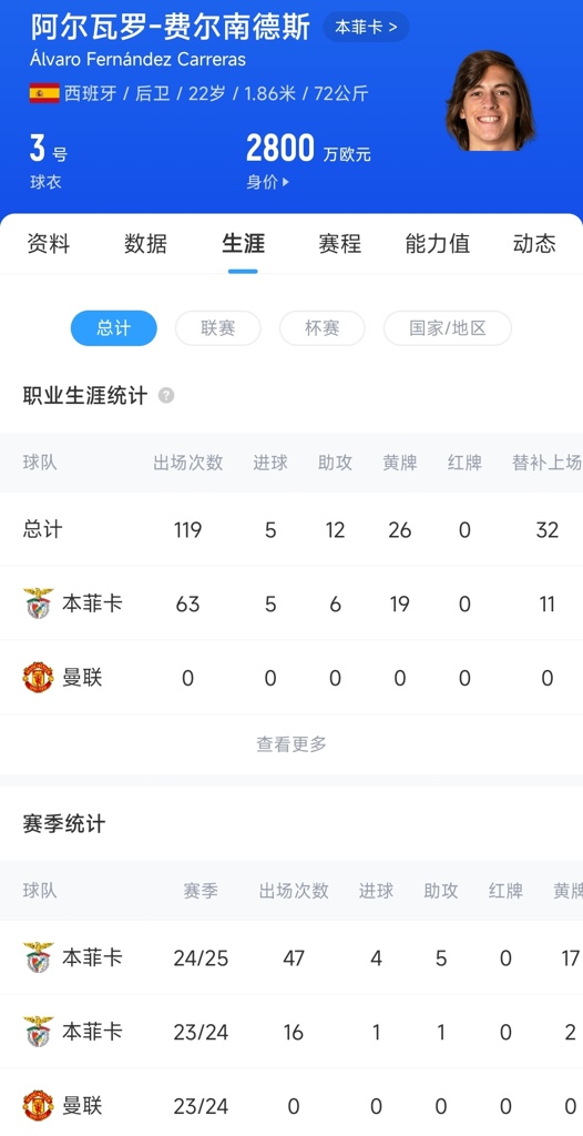 早在2017年,14岁的A费就加入了皇马青训,但因为缺乏机会,A费在2020年转投曼联。随后A费被曼联多次外租,并在2024年被本菲卡买断。随着在本菲卡的出色表现,22岁的A费德转身价已经达到了2800万欧元。