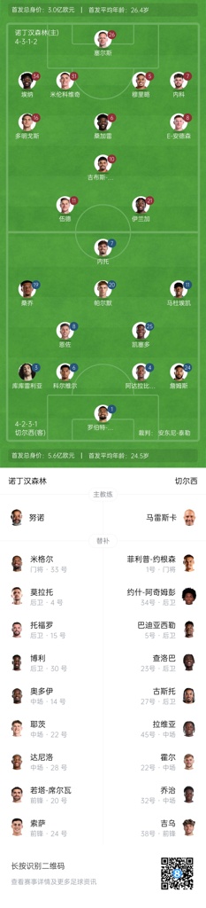 诺丁汉森林首发:26-塞尔斯、7-内科-威廉姆斯、31-米伦科维奇、5-穆里略、34-埃纳、6桑加雷、8-E-安德森、16-多明戈斯、10-吉布斯-怀特、21-伊兰加、11-伍德