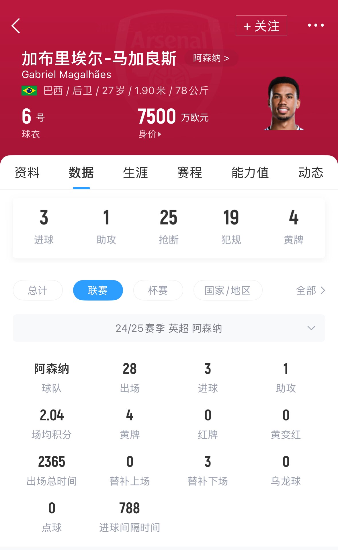 加布里埃尔2020年从里尔加盟阿森纳,转会费2600万欧。目前共代表阿森纳出场210次,打进20球并送出5次助攻。随队拿到一次社区盾杯冠军。此前,加布里埃尔与枪手的合同到2027年6月,球员24/25赛季出场42次,德转身价7500万欧。