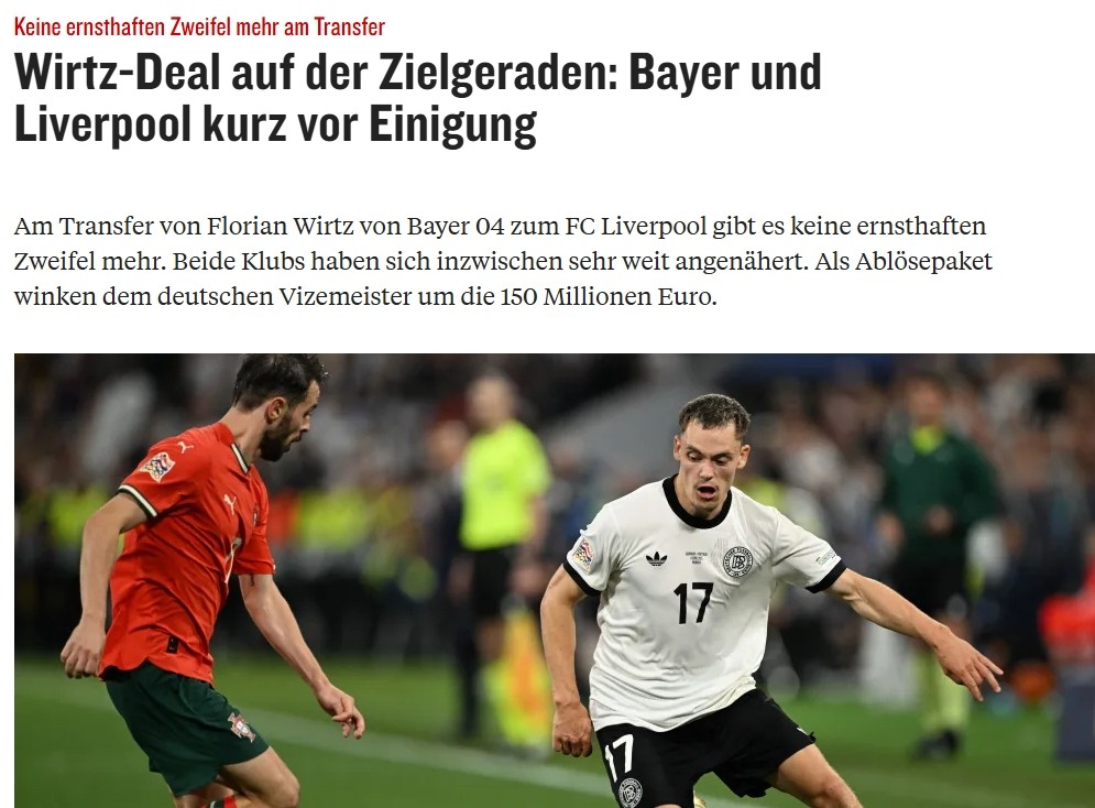维尔茨与利物浦方面已完全达成个人条款。双方俱乐部尚未最终敲定,但已近在咫尺。目前转会总金额(含潜在浮动奖金)正逼近1.5亿欧。