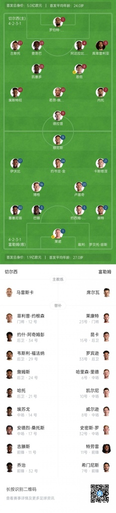 富勒姆替补:23-勒孔特、15-昆卡、33-罗宾逊、6-哈里森-里德、10-凯尔尼、32-史密斯-罗、7-劳尔-希门尼斯、8-哈里-威尔逊、11-特劳雷