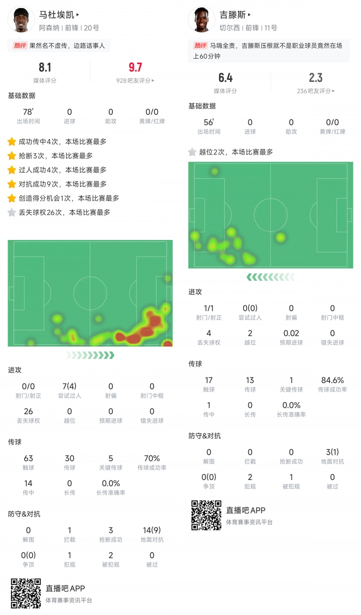 阿森纳新援马杜埃凯表现出色,全场4次过人5次关键传球,帮助阿森纳取得大胜。他14次对抗9次成功,还有3次抢断均是全场最多。