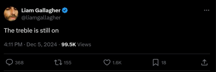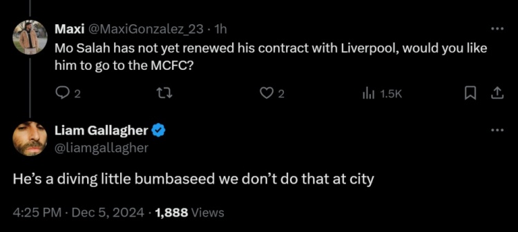 12月5日讯 本轮英超比赛中,曼城一扫阴霾,3-0击败森林,利物浦则是战平了纽卡。赛后,知名曼城球迷、绿洲乐队主唱利亚姆发推庆祝球队获胜。