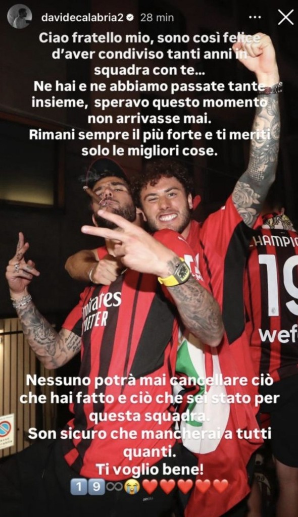卡拉布里亚告别特奥:没人能抹去你为米兰所做的一切