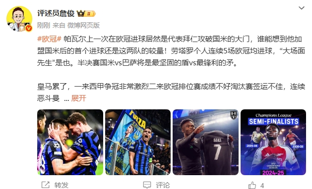 詹俊:国米vs巴萨是最强盾vs最强矛 阿森纳已是成熟的争冠队