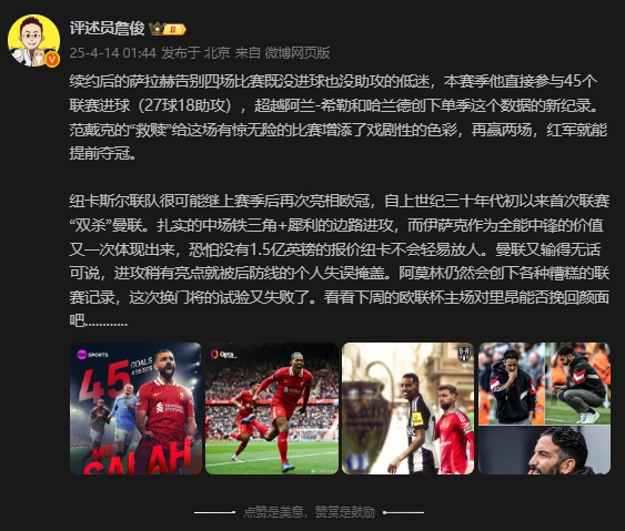 04月14日讯 英超第32轮,曼联客场1-4纽卡斯尔联,赛后,评述员詹俊在社媒发表点评。詹俊:续约后的萨拉赫告别四场比赛既没进球也没助攻的...