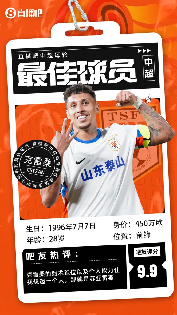 【直播吧】中超第7轮最佳:克雷桑72.5%得票率当选,廖锦涛进前三