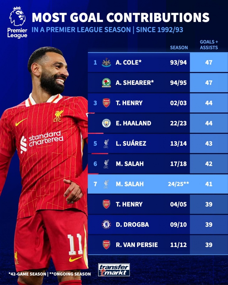 英超单赛季参与进球榜:萨拉赫本赛季41球暂第7,科尔、希勒47第1
