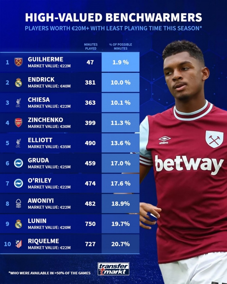 身价2000万欧+球员出场时间最少排行:前20英超占13席